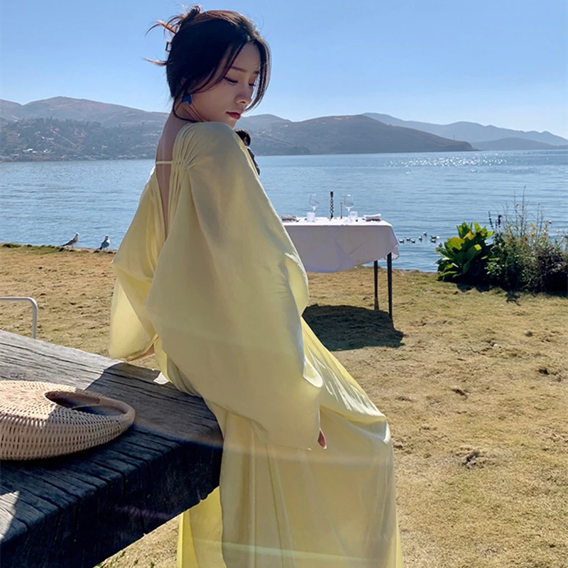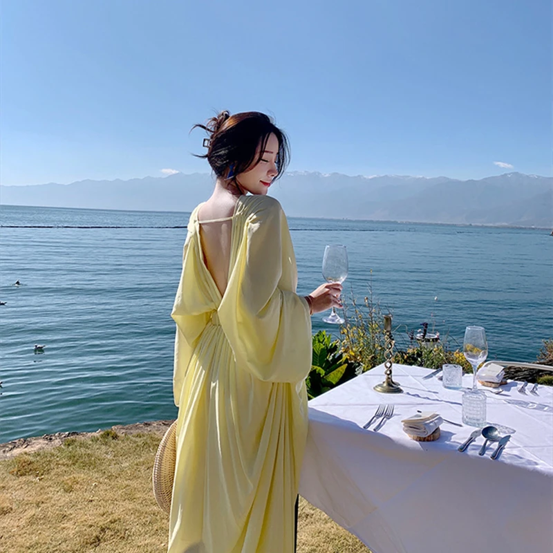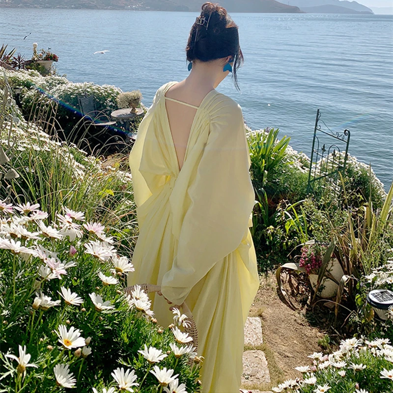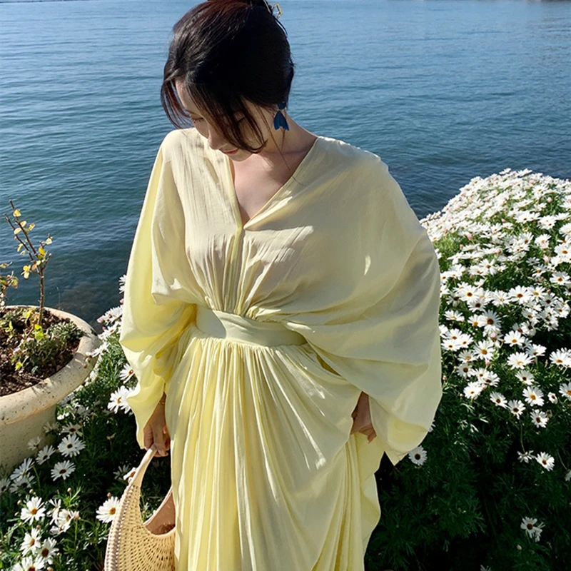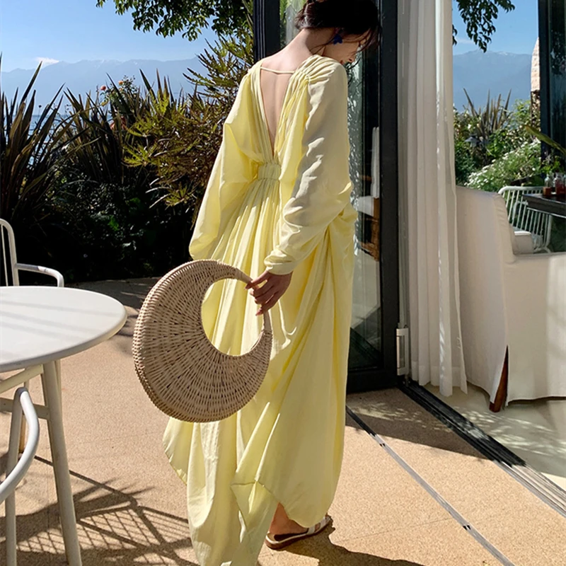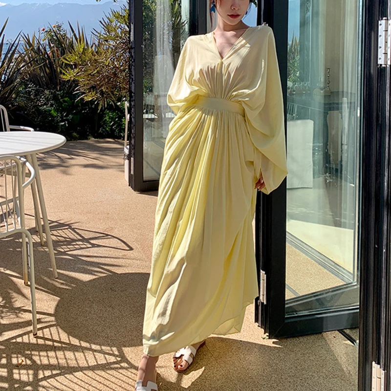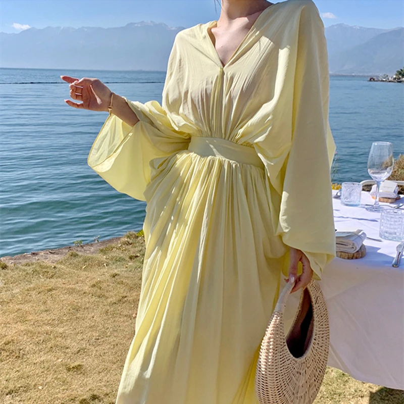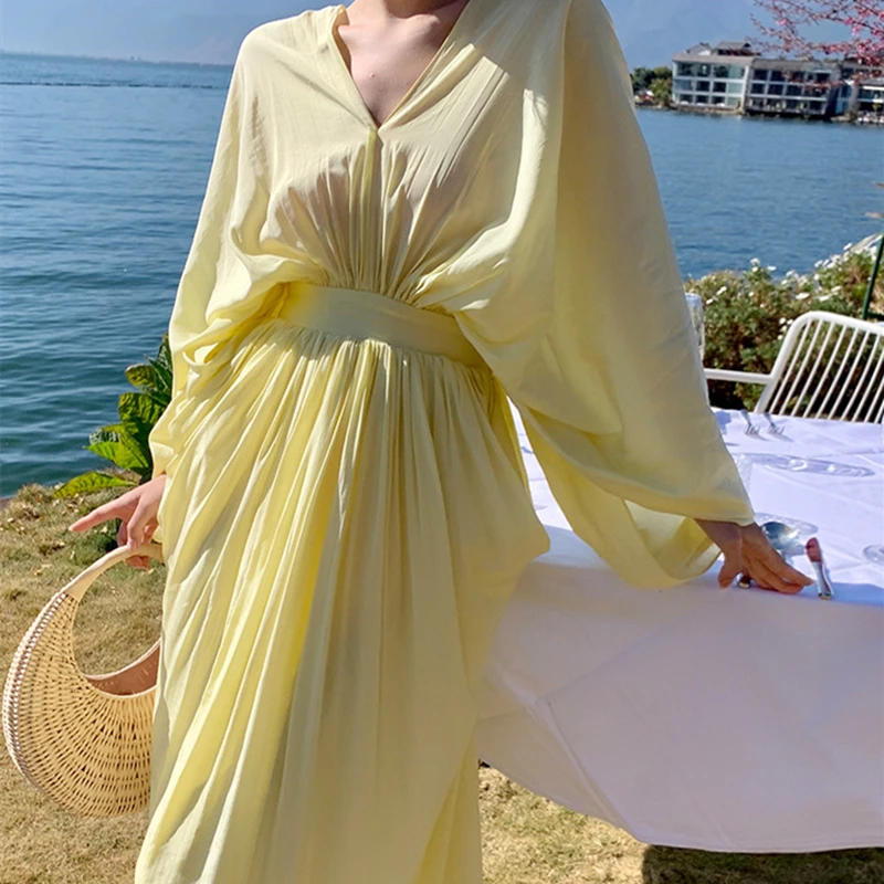 فساتين نسائية جديدة من Horetong فستان فضفاض غير منتظم بياقة على شكل V وأكمام طويلة وخصر مرتفع فستان طويل مكشكش صيفي أنيق للنساء